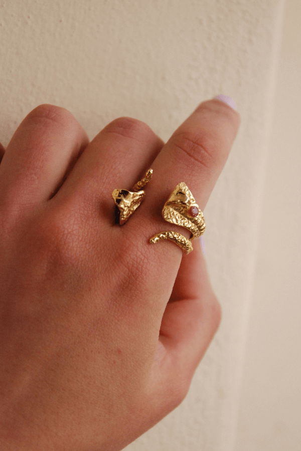 Un anello dal design avvolgente e deciso, con due teste di cobra che si fronteggiano in un intreccio simbolico e potente.