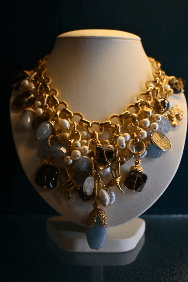 Questa straordinaria collana presenta una catena in argento dorato e lega di rame, arricchita da una cascata di pietre: acquemarine luminose, quarzi fumé e perle di fiume barocche.