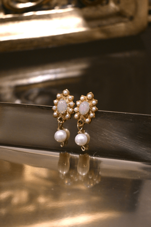 Orecchini con pietra sfaccettata incastonata e circondata da microperle naturali, con perla pendente che dona un tocco di luce in movimento. Perfetti per le occasioni speciali, ma anche per rendere unico un look quotidiano.