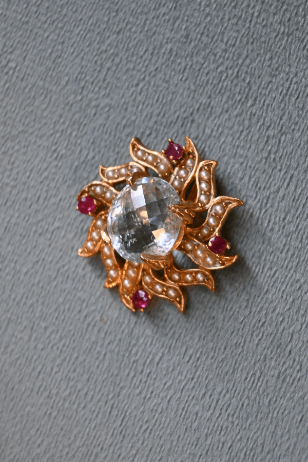 Questo pendente è dominato da un’ acquamarina centrale incastonata in una cornice radiante di microperle e piccoli rubini che danzano come bagliori su raggi dorati.
