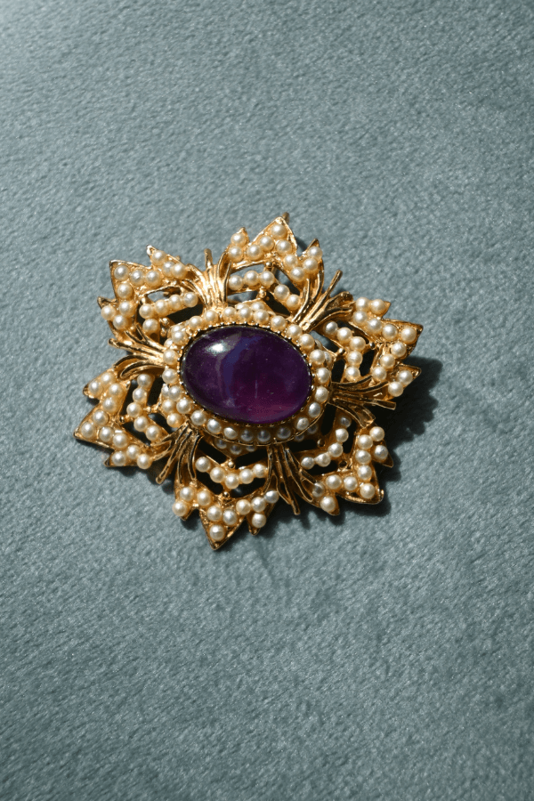 Spilla dorata a forma di stella con cabochon centrale, ispirata ai modelli iconici di Cascio Bijoux. Il disegno ricco e simmetrico evoca il gusto ornamentale del Novecento italiano. Da indossare come pendente su un nastro o una catena, oppure come spilla su giacche e blazer. Un pezzo d’archivio reinterpretato con sensibilità contemporanea.