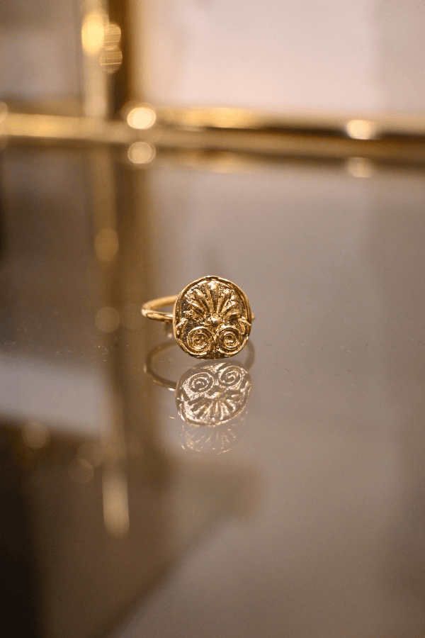 Adjustable ring featuring a motif inspired by an ancient protective symbol from archaic Greece. The engraved forms echo amulets and apotropaic signs, once believed to guard and guide the wearer. A piece that blends symbolic strength with understated elegance. To be worn as an everyday talisman.