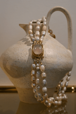 Vintage necklace signed by the KJL x Avon collaboration, featuring grey faux pearls and a refined feline head detail embellished with sparkling crystals. The design blends retro charm with a bold, distinctive presence, instantly becoming the focal point of any look.