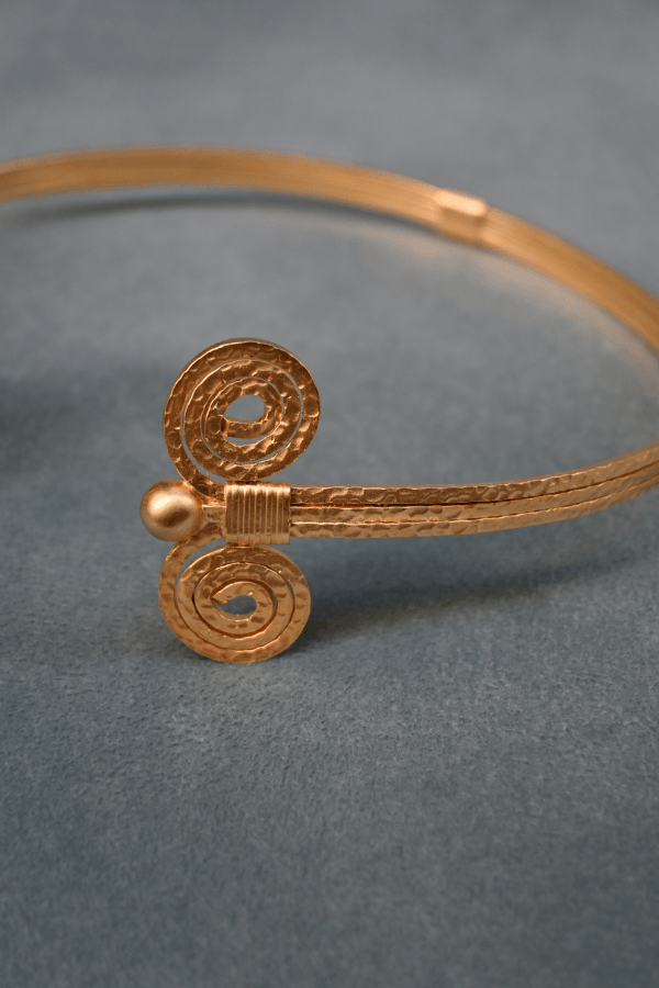 Rigid necklace in yellow bronze with spiral ends. The clean shape is enhanced by a textured finish and details reminiscent of ancient motifs.