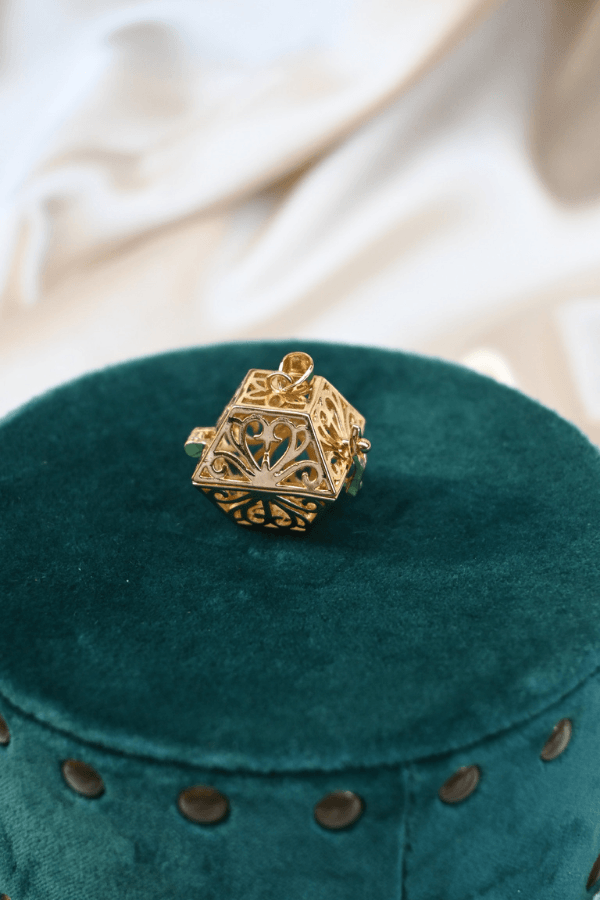 Openwork cage-shaped pendant inspired by small objects from another time, created to hold a fragrance.