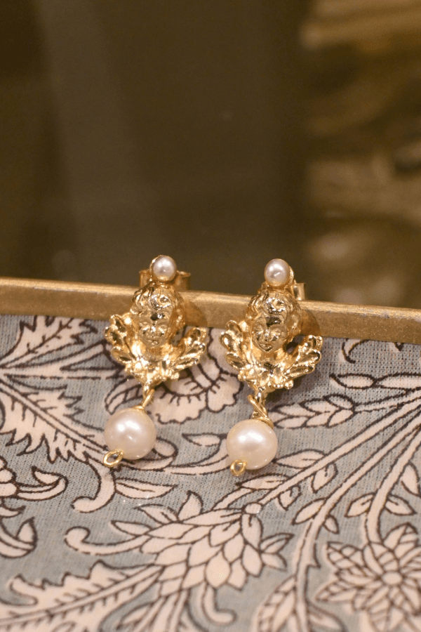 These charming earrings feature a delicate cherub design paired with a lustrous freshwater pearl, combining a touch of vintage romance with timeless elegance.