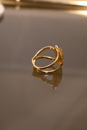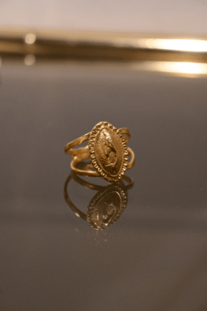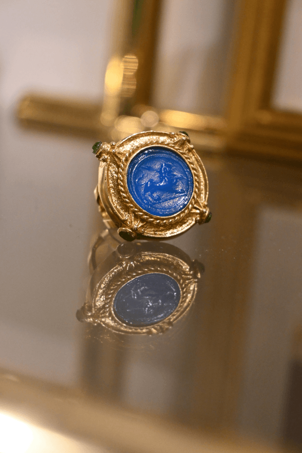A bold ring that feels like a true archaeological find. At its center, a hand-carved cobalt blue glass paste featuring the Chimera, a mythological creature embodying strength and mystery, framed by a richly detailed gold-toned setting.