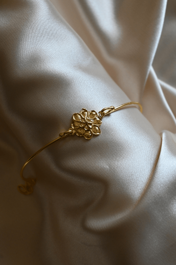 With a central floral element shaped like a small relief. The soft, symmetrical forms evoke ancient decorations, between nature and ornament.