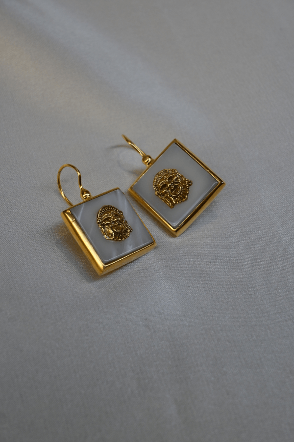 Earrings featuring a square mother-of-pearl element, glowing with a soft, milky light. At the center, a small raised theatrical mask recalls the ancient world and Mediterranean stage traditions.