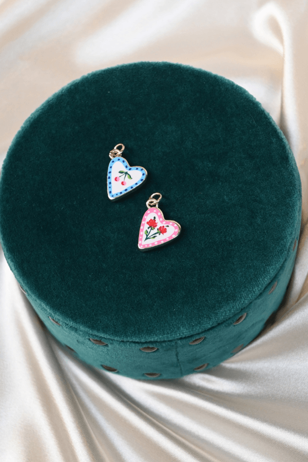 Enamel heart-shaped charm adorned with small hand-painted floral motifs.