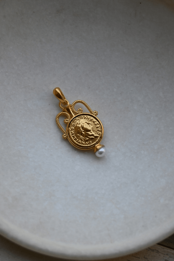 The engraved face recalls ancient iconography, with a compact and bold presence. A piece that carries memory and symbolic strength.