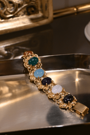 The design unfolds into a layered and striking composition, featuring figurative elements and decorative details enhanced by sparkling crystals.