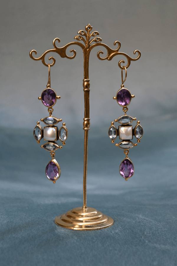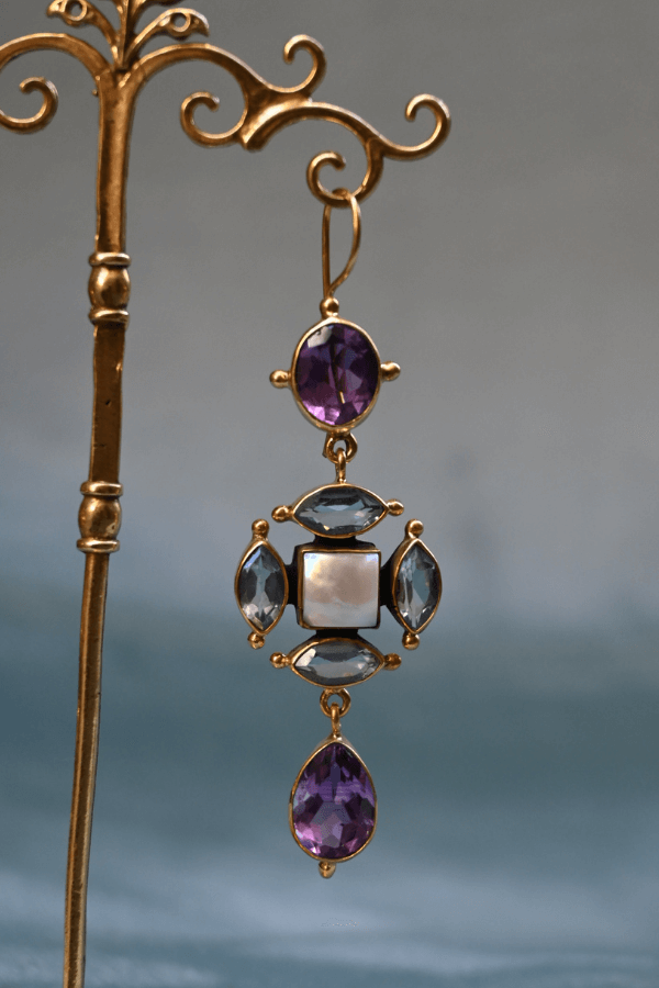 These stunning earrings combine the iridescent beauty of mother of pearl with the rich hues of amethyst and vibrant blue topaz.