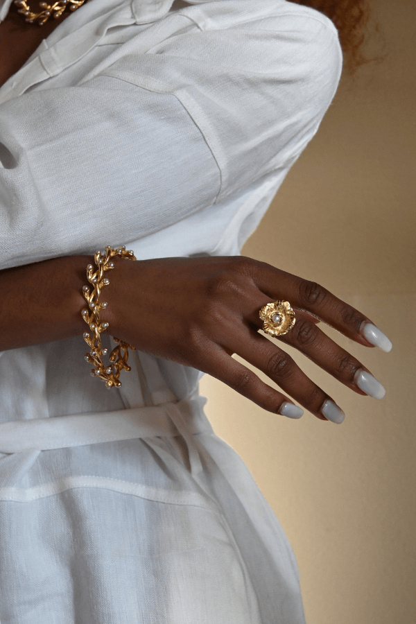 This delicate, romantic ring features a dainty rose paired with a tiny pearl, offering a touch of sweetness to any look.