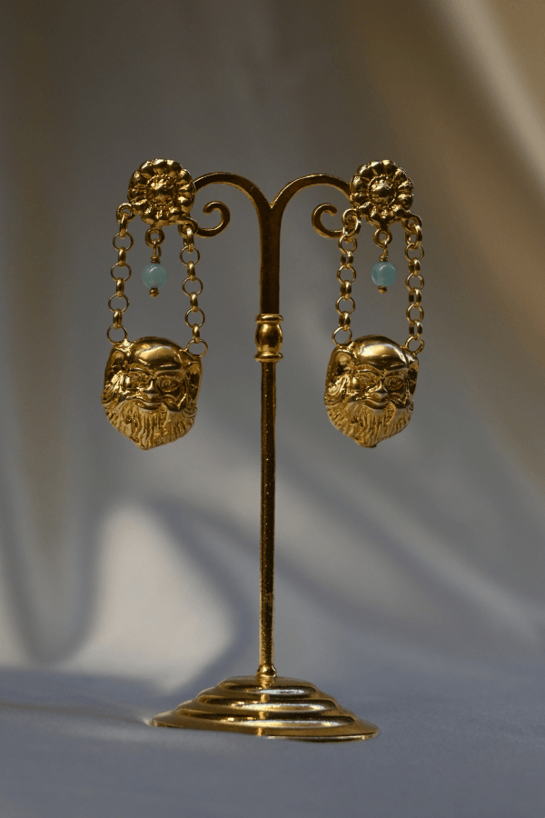Earrings composed of small moving elements, suspended by fine chains that follow every gesture. The raised face creates a strong presence, balanced by the lightness of movement and the glow of blue chalcedony.