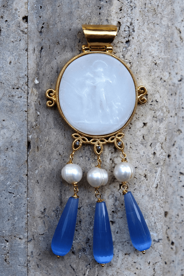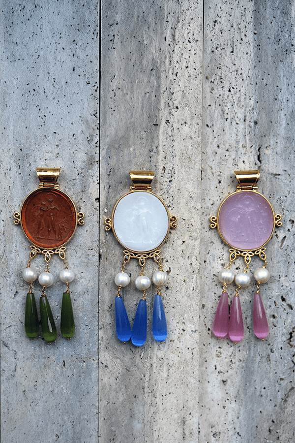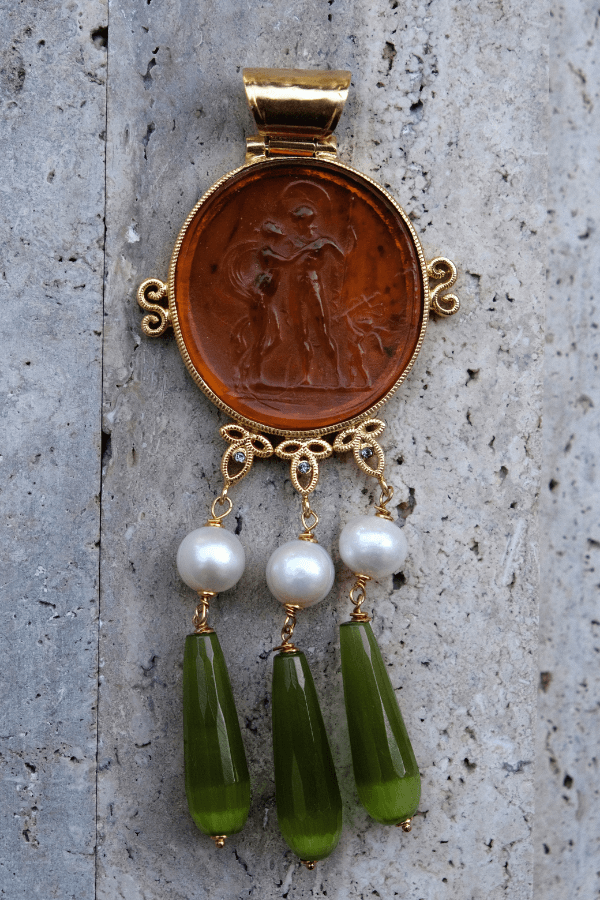 Large glass paste pendant engraved with the scene of Venus and Mars. In classical tradition, they represent the union of love and strength, a recurring theme in ancient art. The setting is enriched with freshwater pearls and drop pendants, adding movement and presence.